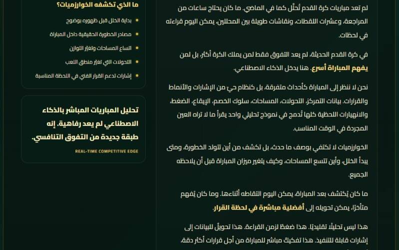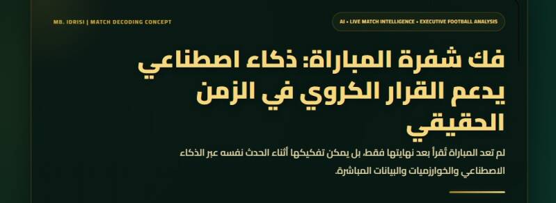 فك شفرة المباريات المباشرة عبر الذكاء الاصطناعي الكروي يمثل اليوم أحدث تطور في أدوات التحليل الكروي، وهو ما بدأت تعتمده الأندية الاحترافية ولجانها الفنية لفهم المباراة أسرع واتخاذ القرار في اللحظة المناسبة