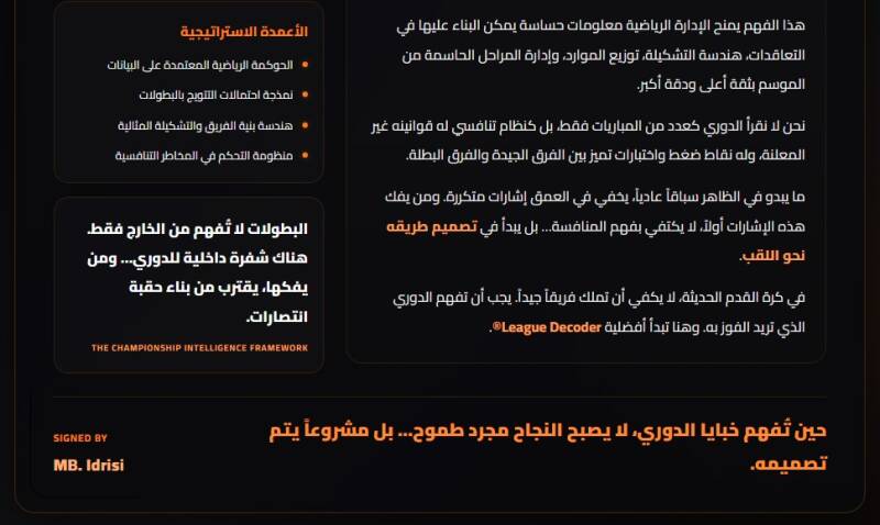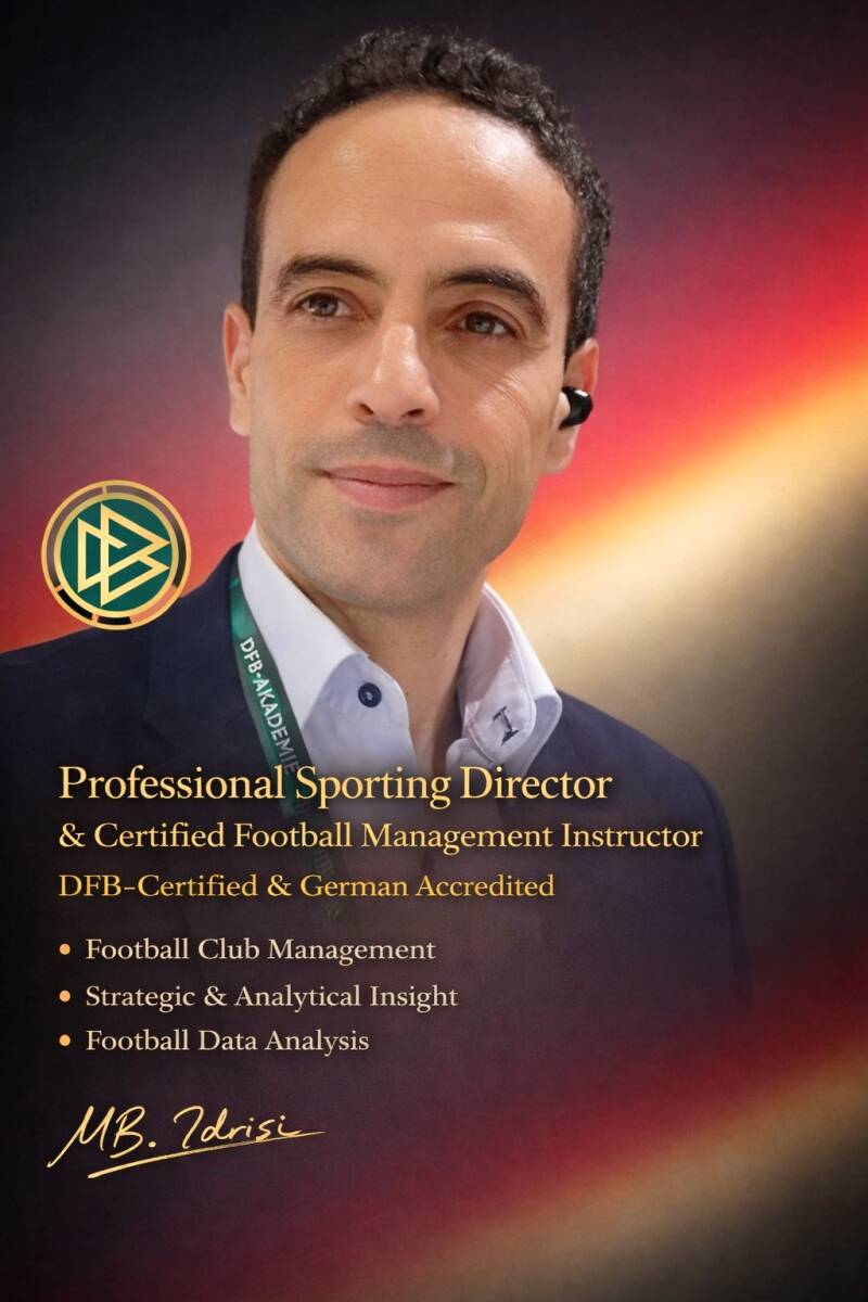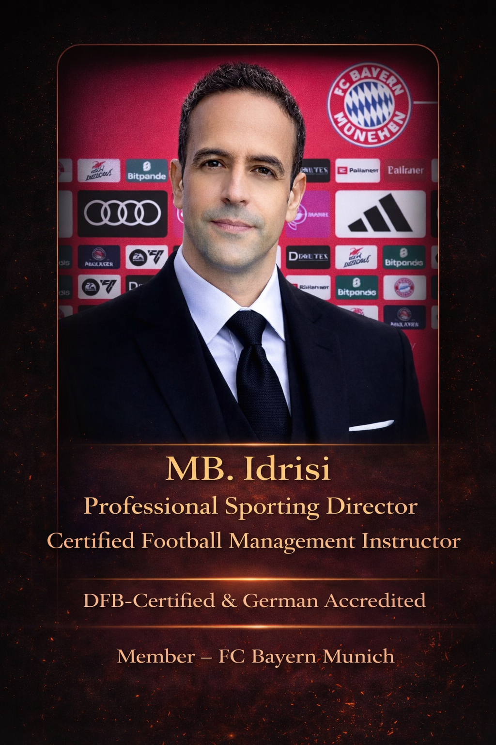 الى جانب كوني مديرًا رياضيًا معتمدا بتكوين علمي أوروبي، ومحاضرًا معتمدًا في الإدارة الرياضية وخبير علم البيانات في كرة القدم، فإنني أفتخر بكوني عضوًا منخرطًا منذ سنوات في نادي بايرن ميونيخ الألماني، النادي الذي يُعد أحد أنجح الأندية في تاريخ كرة القدم إالحديثة، وأكثرها تطورًا إداريًا وفنيا